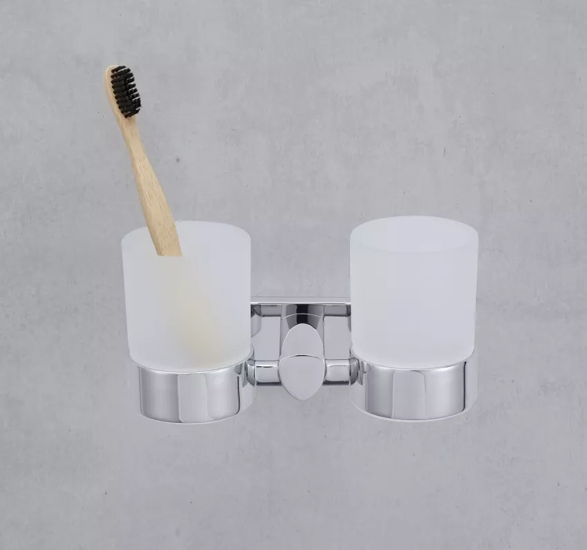 Der Doppelglashalter Biasca verchromt bietet eine elegante und praktische Lösung zur Aufbewahrung von Zahnbürsten und Zahnpasta in Ihrem Badezimmer.