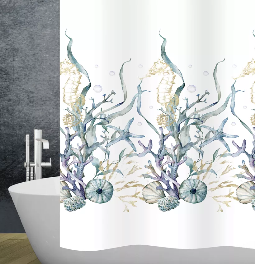 Immergez-vous dans l'atmosphère relaxante de la mer avec le rideau de douche décoratif Marina. Le motif de coquillages et de coraux dans des couleurs subtiles apporte des sensations de plage à votre salle de bain.